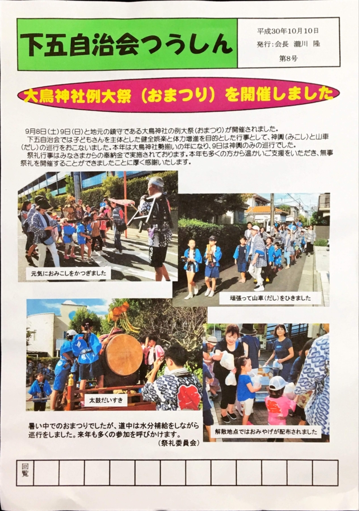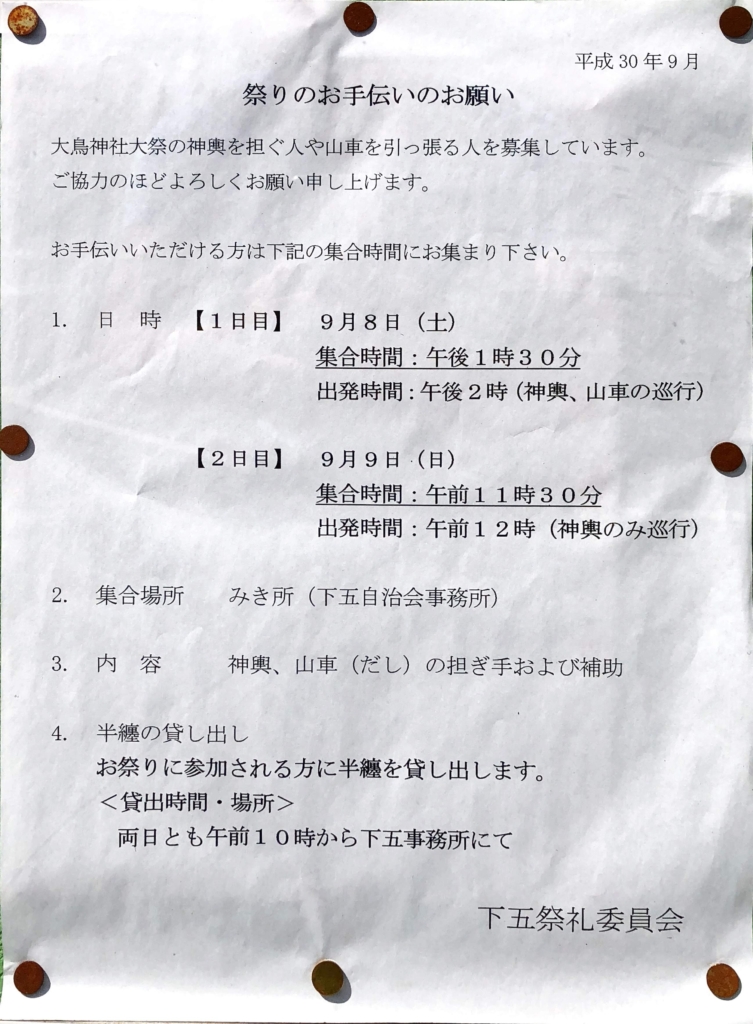 大鳥神社例大祭が平成30年9月8日(土)と9日(日)に行われます。下五自治会としても神輿(大人と子ども両方)と山車(だし)で町内を巡行します。お子さまもご一緒に奮ってご参加ください。皆さまのご参加をお待ちしています!