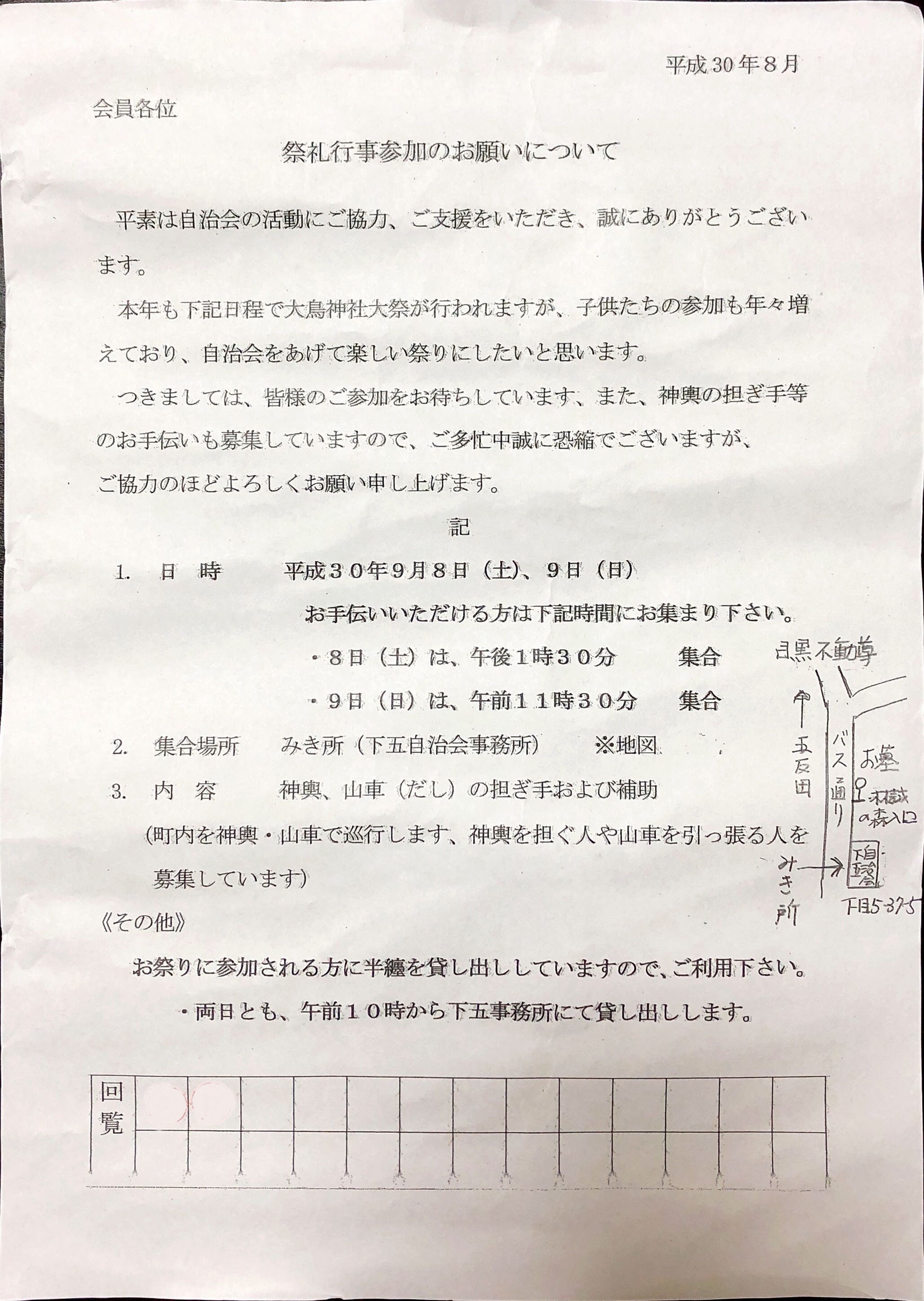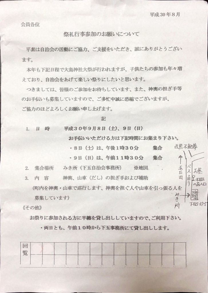 お祭り参加のお誘い(平成30年大鳥神社例大祭)