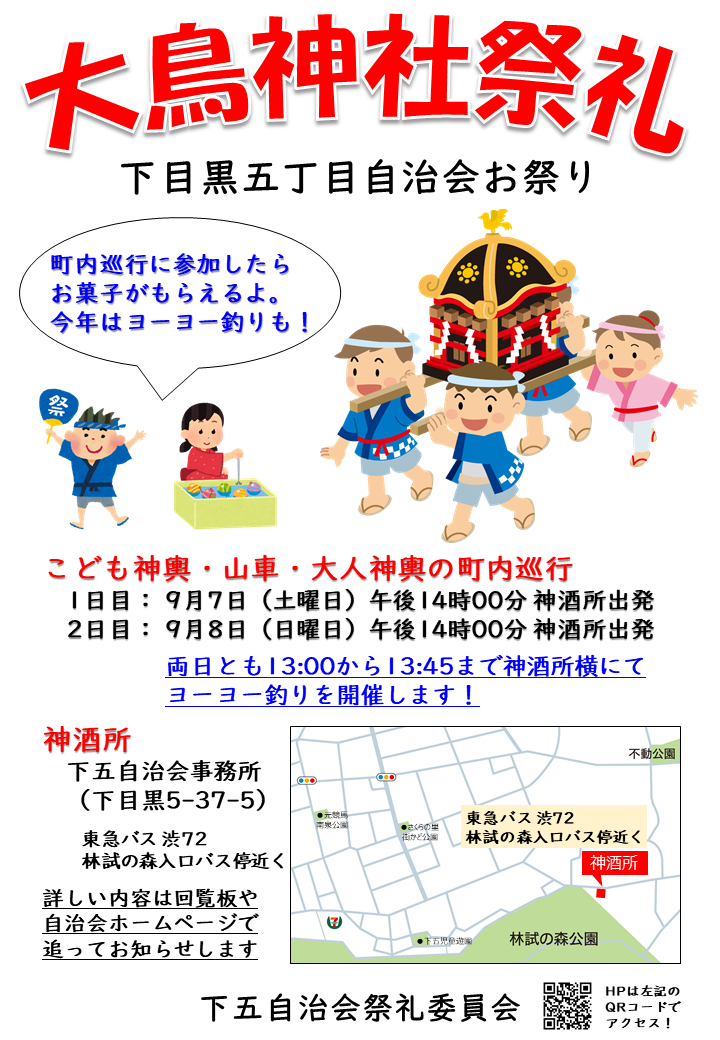 今年も大鳥神社の祭礼が「9月7日(土)と8日(日)」に行われます。下目黒五丁目自治会では、それに合わせて地域住民の交流や子供たちが参加できる行事としてお神輿や山車の町内巡行を行います。