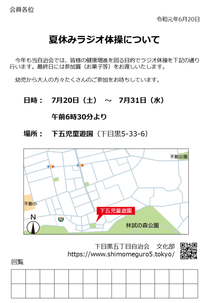 回覧板や掲示板でお知らせしていましたが、2019年7月20日(土)から7月31日(水)まで、毎朝午前6時30分から下五児童遊園(下目黒5-33-6)にてラジオ体操を行います(雨天中止)。