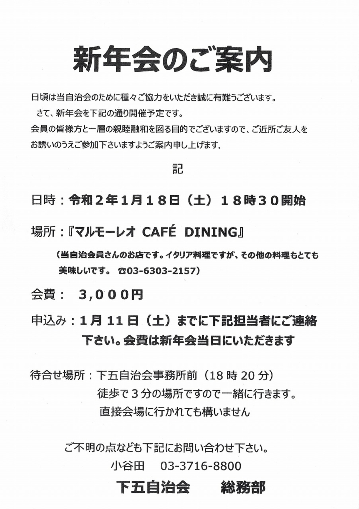 令和2年1月18日(土)18時30分から下五自治会の新年会を開催します。今回は、当自治会員でもあるマルモーレオ カフェ ダイニング(目黒区下目黒5-37-14 グリーンサイドビルB1F)で行います。ご家族・ご近所・ご友人含めて、皆さまのご参加をお待ちしています。