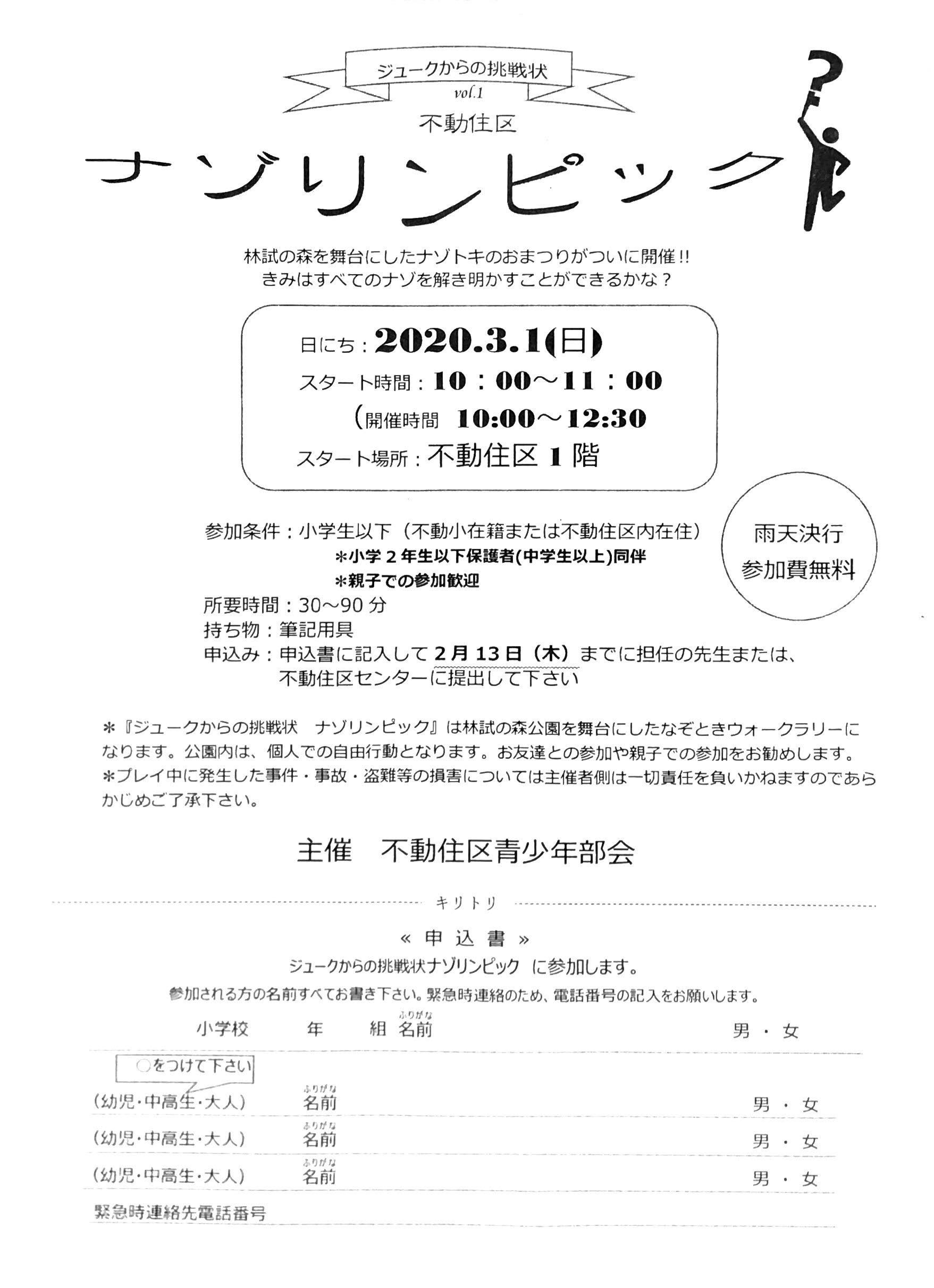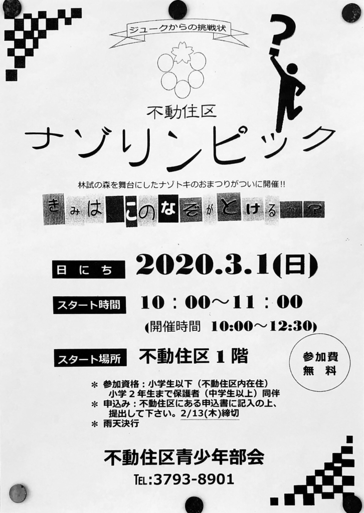 令和2年3月1日(日)に予定されていた不動住区ナゾリンピックは中止との連絡がありました。(以下は元の投稿として掲載していますことご了承ください)[2020/02/23 18:30更新]