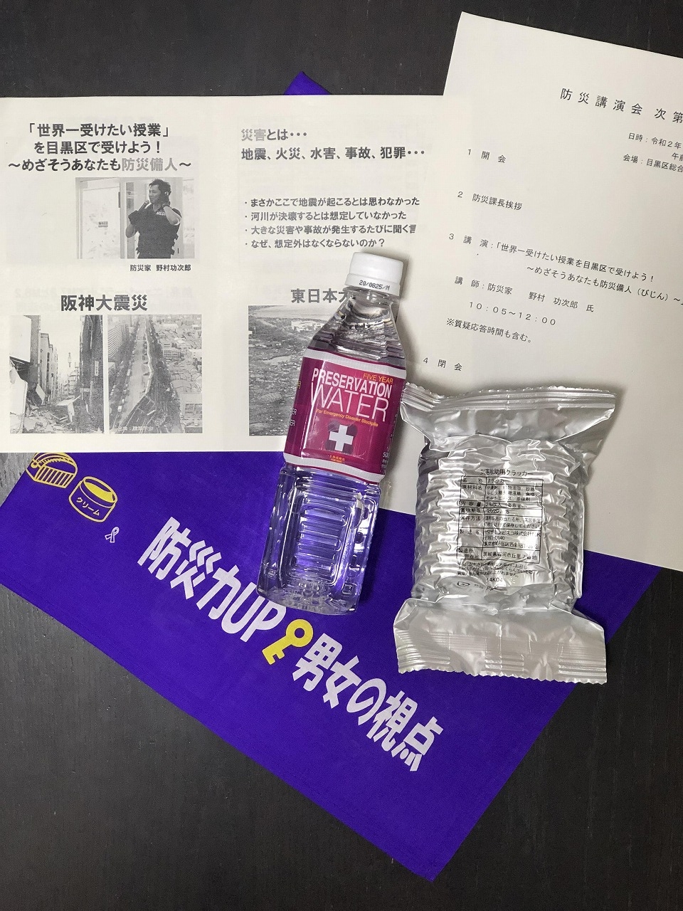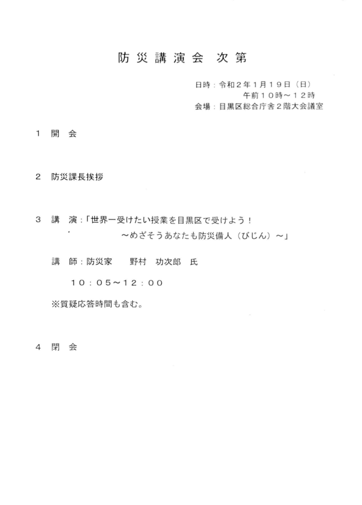 2020年1月19日(日)に目黒区役所で開催された防災講演会「世界一受けたい授業を目黒でも受けよう!~めざそうあなたも防災備人~(講師:防災家 野村功次郎氏)」に参加してきました。
