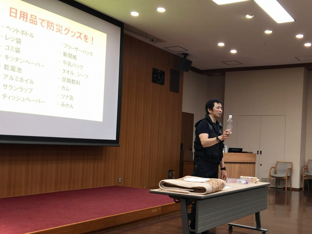 災害とは・危機管理の基本・防災家野村からの提案(ランドセルで頭(首)を守る、LINE位置情報等々)や日用品で防災グッズの実演など、子供から大人まで分かりやすく、すぐ取り組める内容を知ることができた講演会でした。自治会としても防災をしっかり考えたいと思います。
