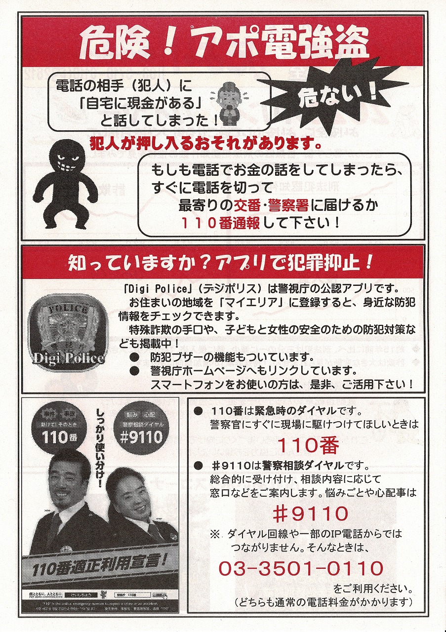 目黒警察署から、めぐろ安全安心だより(12月・1月合併号)が届きました。 下五自 ...