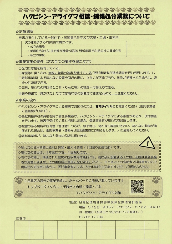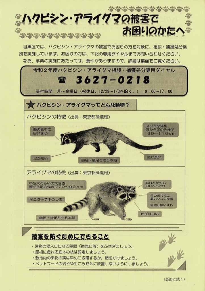 ・ハクビシン・アライグマの被害でお困りのかたへ(目黒区環境清掃部)