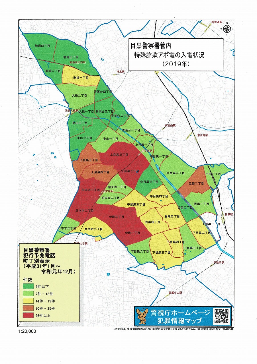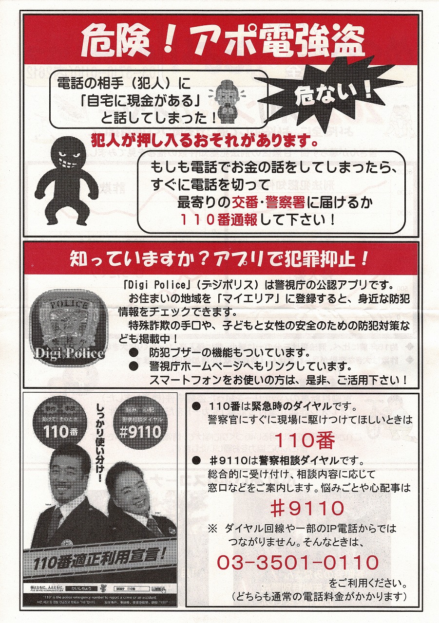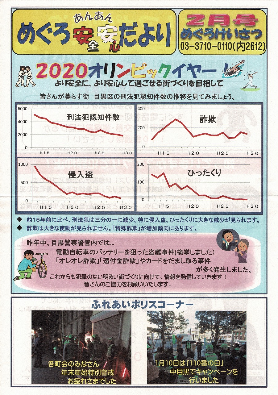 目黒警察署から、めぐろ安全安心だより(2月号)と特殊詐欺アポ電の入電状況(2019年)が届きましたのでご覧ください。