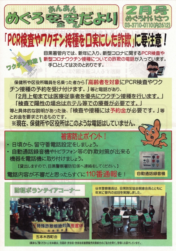 目黒警察署から、めぐろ安全安心だより(2月号)が届きましたのでご覧ください。新型コロナウイルス感染症に便乗した詐欺に注意しましょう。