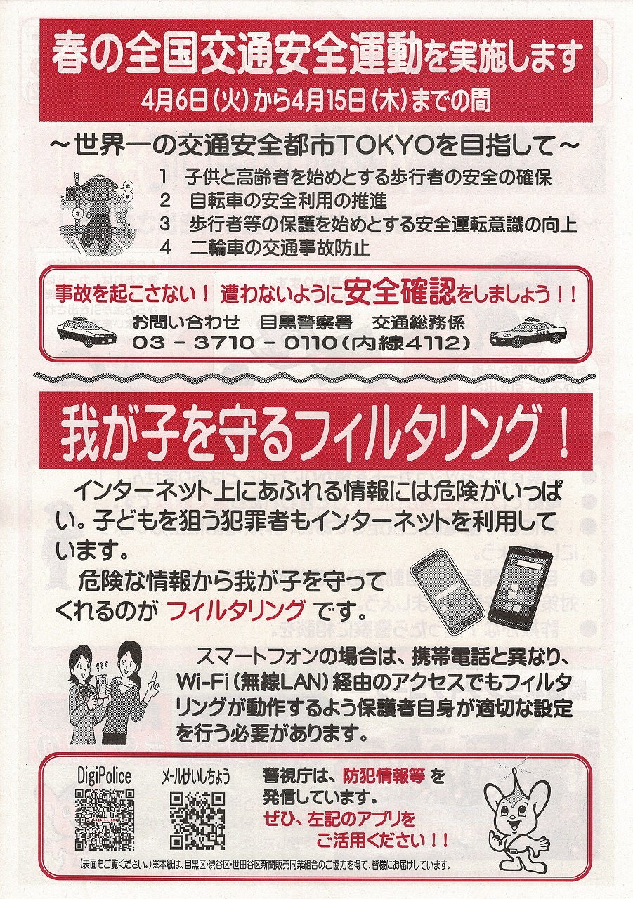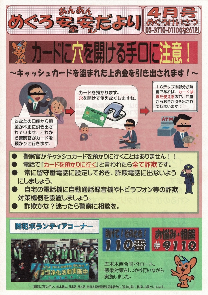 目黒警察署から、めぐろ安全安心だより(4月号)が届きましたのでご覧ください。「キャッシュカードに穴を開ける」という詐欺に注意しましょう。NHKの「STOP詐欺被害!」では、様々な特殊詐欺について詐欺被害防止の啓発情報を提供しています。