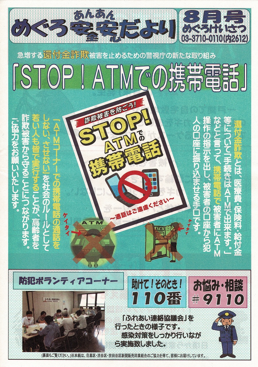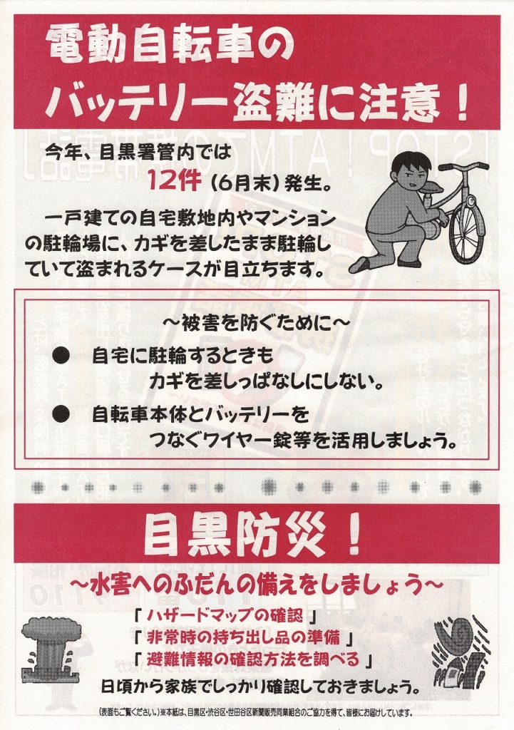 目黒警察署から、めぐろ安全安心だより(8月号)が届きましたのでご覧ください。還付金詐欺や電気自転車のバッテリー盗難にご注意ください。また、台風シーズンには風水害への普段の備えが大切です。まずはハザードマップを確認しておきましょう。
