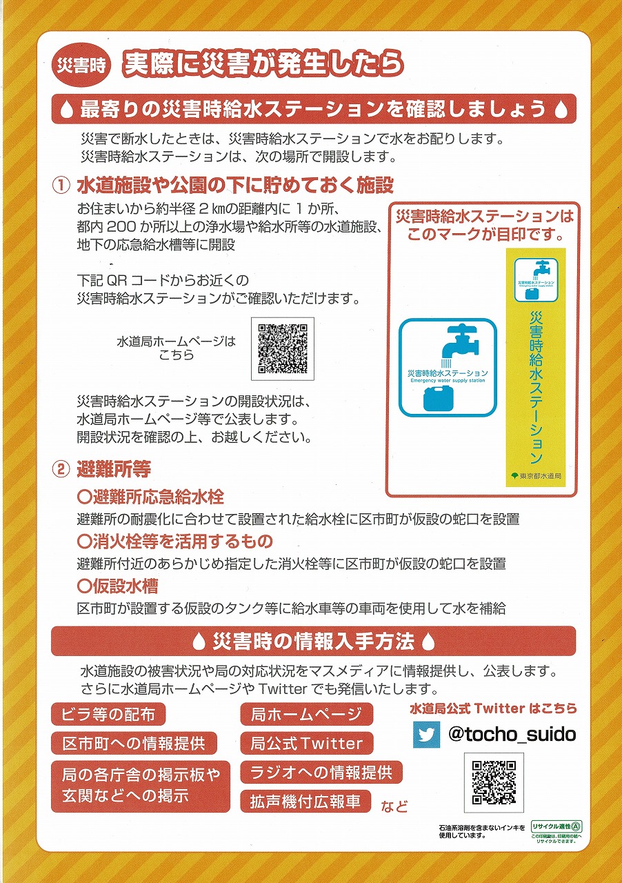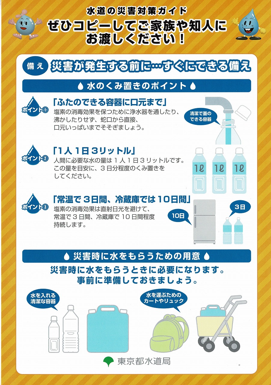 今回のテーマは「震災対策」でしたので、東京都水道局の方からは、水道水が届くまでの仕組みや震災対策(耐震性に優れた水道管である耐震継手管への取り替え工事災害発生時の給水)について教えていただきました。また、目黒区の方からは目黒区内に2つある災害時給水ステーション(八雲給水所及び都立林試の森公園)での目黒区としての取り組み(1ℓパックでの水の提供)や地域避難所での給水についての説明がありました。いただいた資料も参考にして水道についてもっと知る様にしたいと思います。