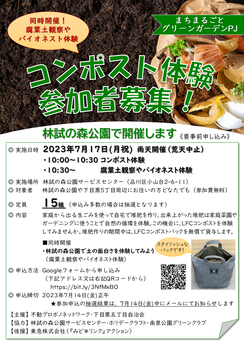 下目黒五丁目自治会と不動プロボノネットワーク、南泉公園グリーンクラブ、東急株式会社(みど*リンクアクション)が共同で行う「まちまるごとグリーンガーデンプロジェクト」での、コンポスト体験の参加者を募集します!