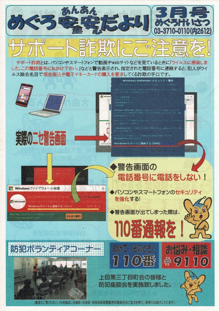 目黒警察署から、めぐろ安全安心だより(2023年3月号)が届きました。サポート詐欺と最近の強盗・侵入窃盗への注意喚起がされています。