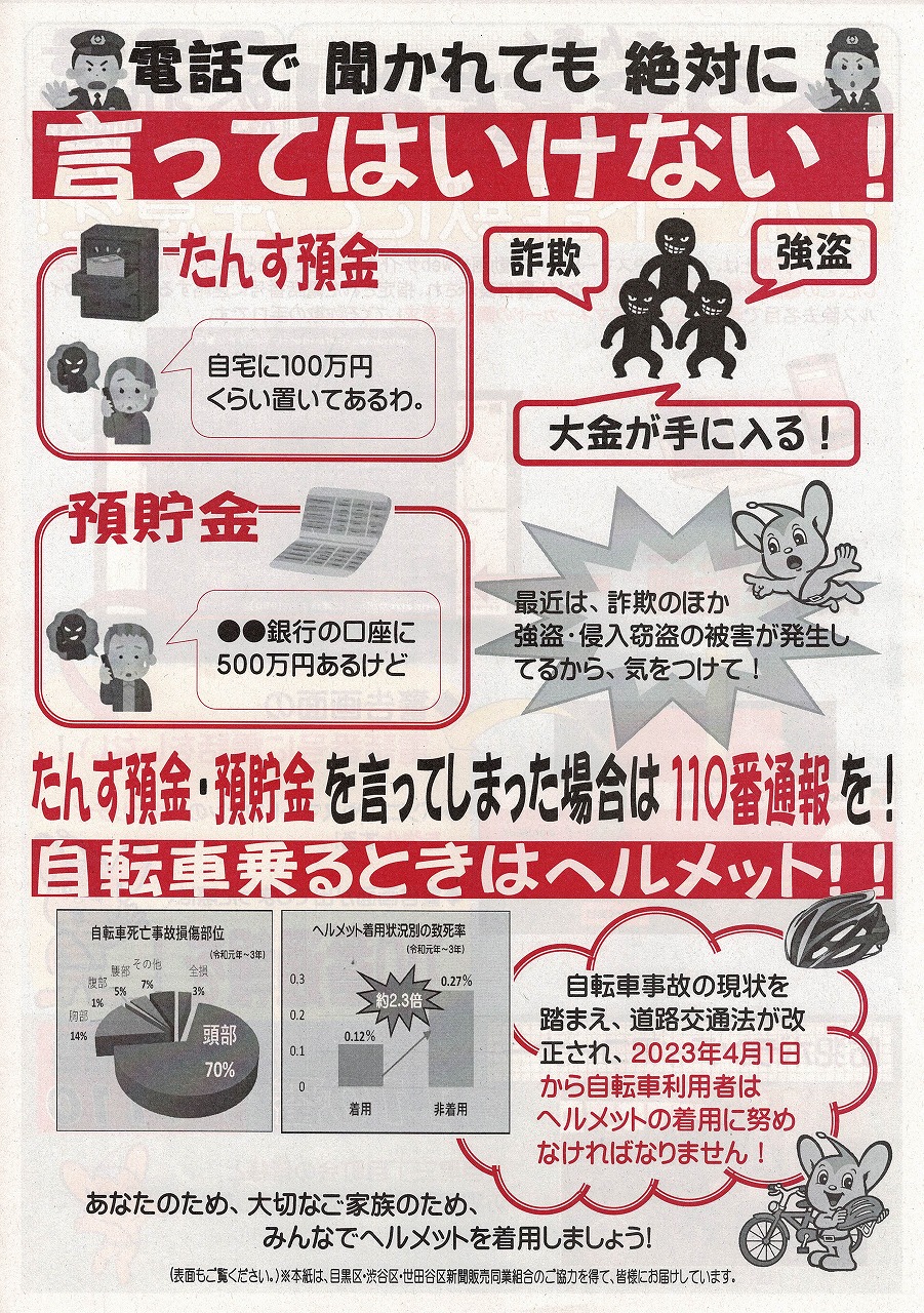 目黒警察署から、めぐろ安全安心だより(12月・1月合併号)が届きました。 下五自 ...