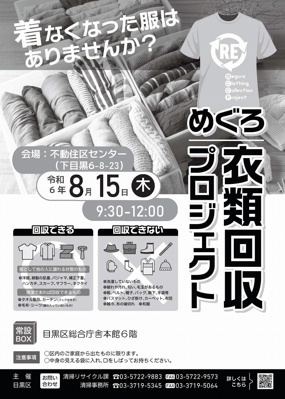 目黒区が行っている「めぐろ衣類回収プロジェクト」として、自分では着なくなったけれど、他の人がリユース(再使用)できる衣類を、以下の日時に不動住区センターで回収が行われます。また、チラシにも掲載がありますが、目黒区役所(総合庁舎本館6階)には常設の回収ボックスもあります。