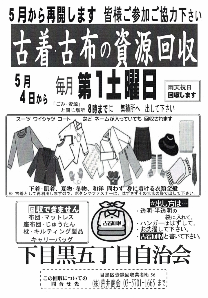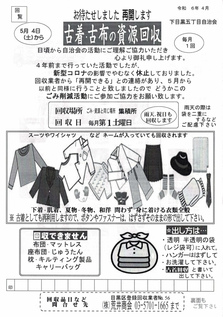 新型コロナの影響等により無期限休止としていた「古着古布の資源回収」を、2024年5月4日(土)より再開します。回収方法は、休止前と同様ではありますが、この数年間の間に下目黒5丁目に引っ越してきた方には、はじめてのことになりますので、以下のチラシをご覧頂き、毎月第1土曜日の回収日の朝8時までに、いつものごみ集積所へお出しください。