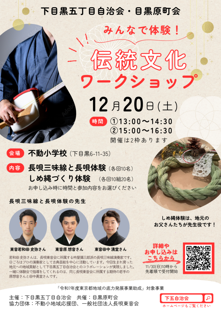 下目黒五丁目自治会と目黒原町会が共同で、今年を締めくくる「文化体験会~みんなで体験 伝統文化ワークショップ」を開催します!伝統文化を感じる機会として、ぜひご参加ください。体験については、以下より事前のお申し込みをお願いします。