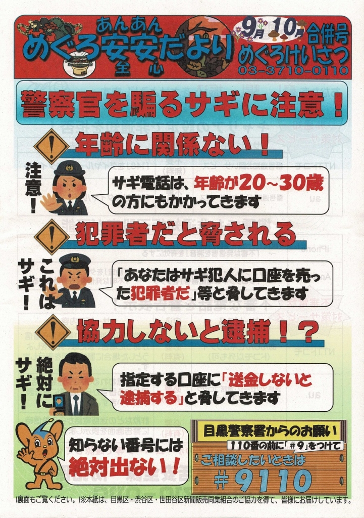 目黒警察署から、めぐろ安全安心だより(2024年9月・10月合併号)が届きました ...