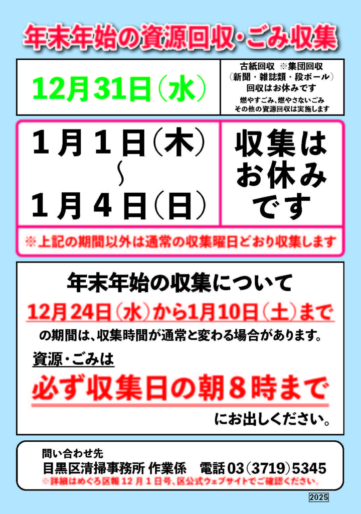 2025年(令和7年)12月24日(水曜日)から2026年(令和8年)1月10日(土曜日)までの期間は収集時間が通常と変わる場合がありますので、この期間の資源・ごみは必ず収集日の朝8時までにお出しください。