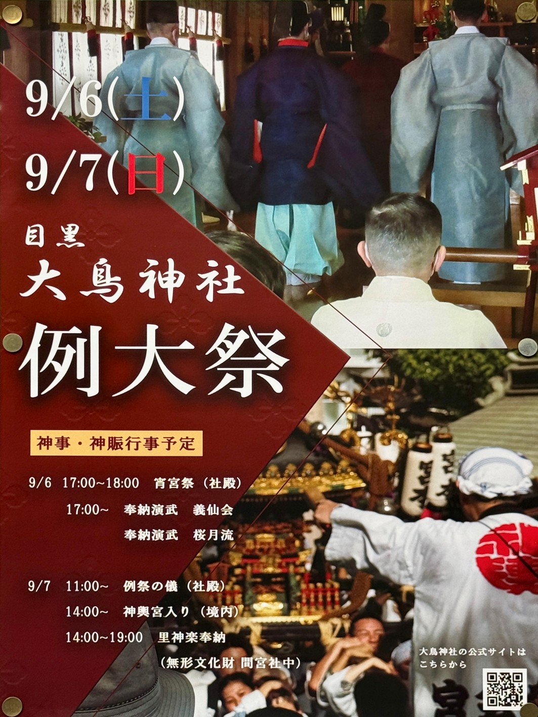 2025年9月6日(土)・7日(日)は目黒大鳥神社の例大祭です。下目黒五丁目自治会としては山車の町内巡行や神輿の渡御を行います。詳細は、こちら(下五自治会お祭り開催のお知らせ)をご覧ください。
