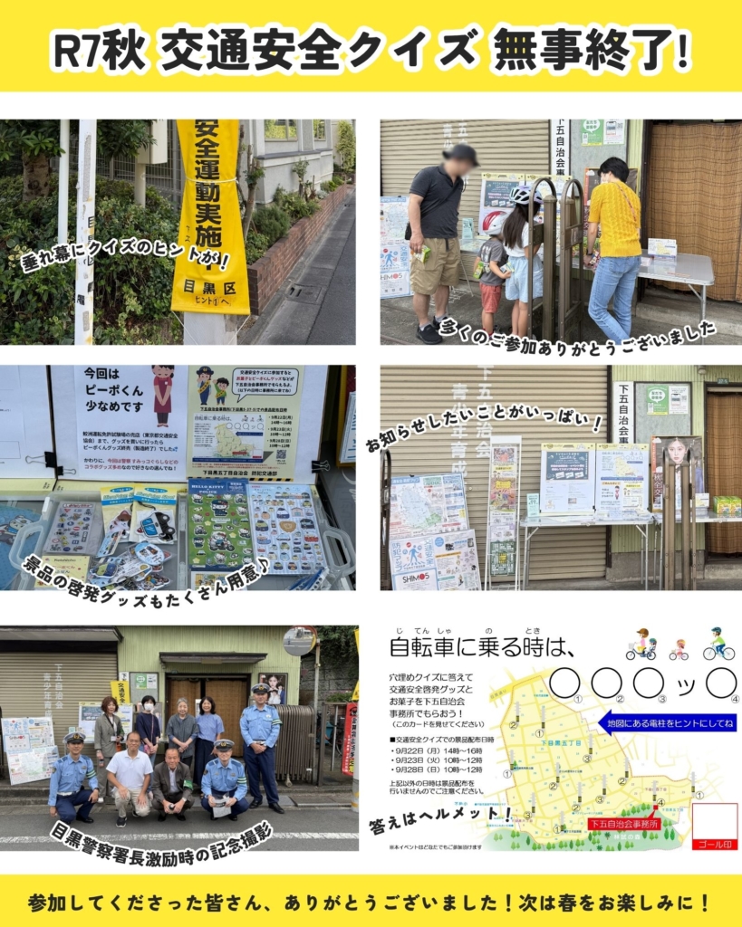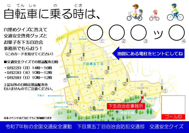 下目黒五丁目自治会では、令和7年秋の全国交通安全運動に合わせて、「交通安全クイズ」イベントを今回も実施します。交通安全クイズに参加して、お菓子やピーポくんグッズ等を下五自治会事務所でもらおう!