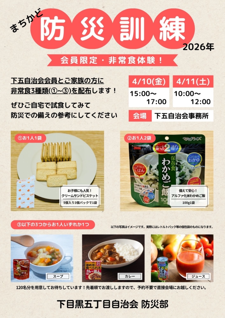 下五自治会の会員の方を対象に、「まちかど防災訓練」として、非常食体験会(配布会)を行いますので、日ごろの防災の備えの参考にしてみてください。