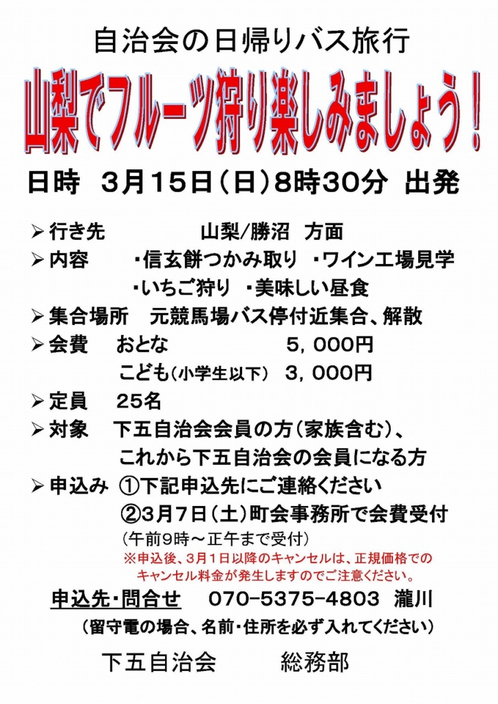今年も下目黒五丁目自治会の日帰りバス旅行を開催します。地域の皆さまと一緒に、早春の山梨で楽しいひと時を過ごすことができればと思います。