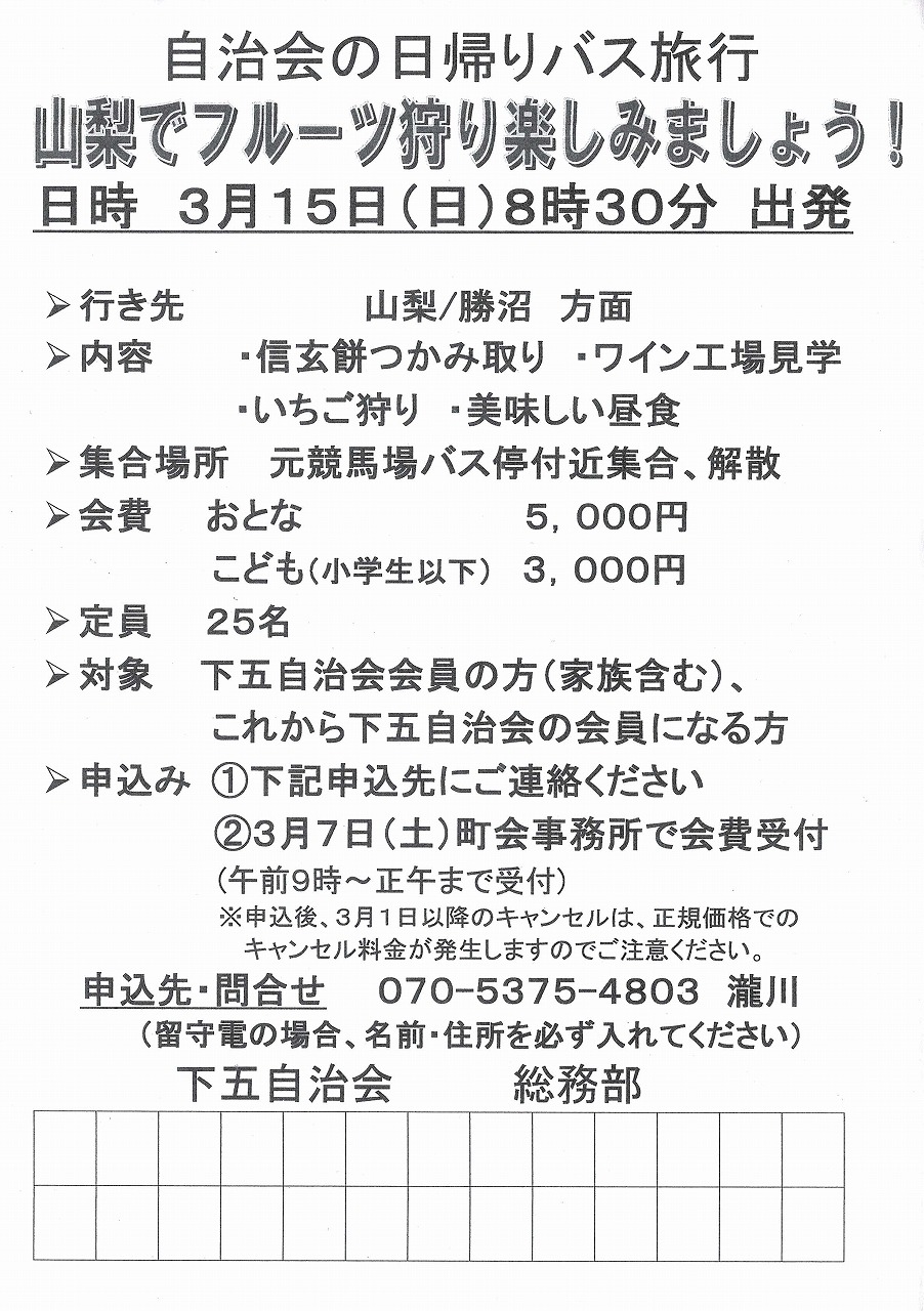今年も下目黒五丁目自治会の日帰りバス旅行を開催します。地域の皆さまと一緒に、早春 ...