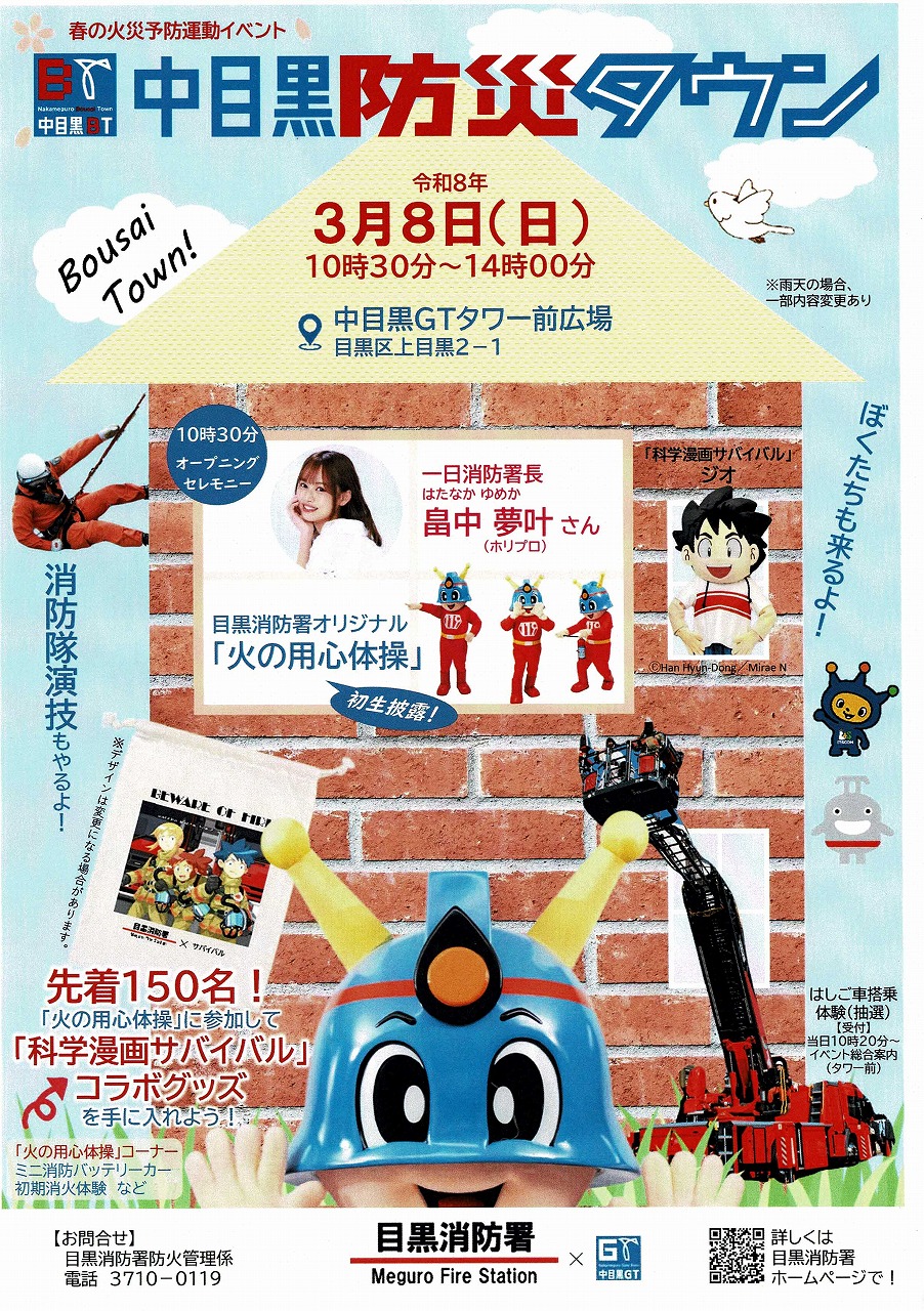 2026年3月1日(日)から7日(土)は、春の火災予防運動です。このタイミングで、今一度火災への備えを確認してみましょう。また、目黒消防署管内では、3/8(日)10時30分から中目黒GTタワー前広場にて、防災イベントが行われます。この機会にぜひ足を運んでみてください。