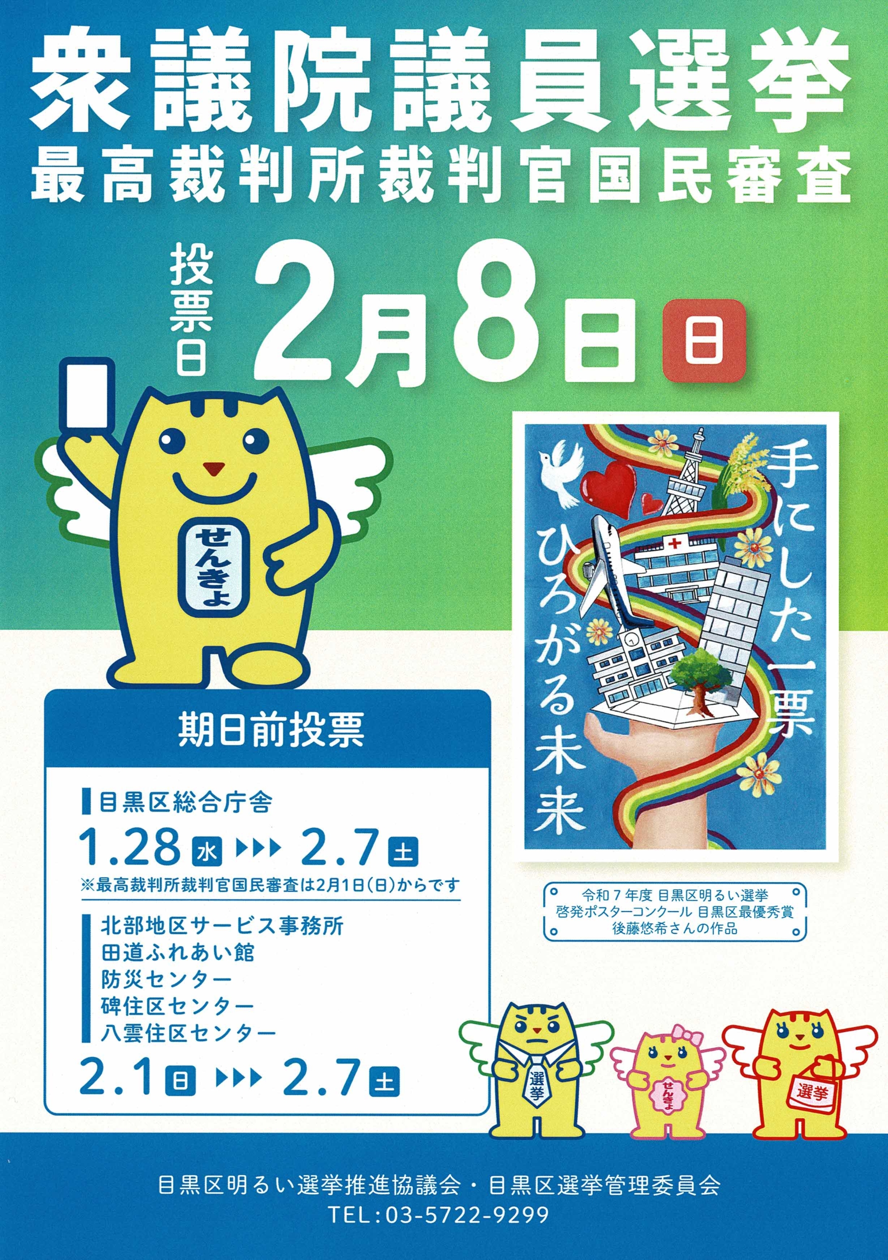Top>掲示板・回覧板・周知 2月8日は衆議院議員選挙(2026年)2026年1月31日 2026年2月8日(日)は、衆議院議員選挙が行われます。期日前投票や当日の投票所などの詳しい情報は以下の目黒区ホームページをご覧ください。 第51回衆議院議員選挙 | 目黒区第51回衆議院議員選挙 | 目黒区 このサイトではJavaScriptを使用したコンテンツ・機能を提供しています ... https://www.city.meguro.tokyo.jp/kusei/senkyo/shugiinn/index... ■過去の選挙結果はこちら 選挙の記録 | 目黒区選挙の記録 | 目黒区 このサイトではJavaScriptを使用したコンテンツ・機能を提供しています。JavaScri ... https://www.city.meguro.tokyo.jp/senkyo/kusei/senkyo/kiroku.... 掲示板・回覧板・周知掲示板Posted by 下五自治会