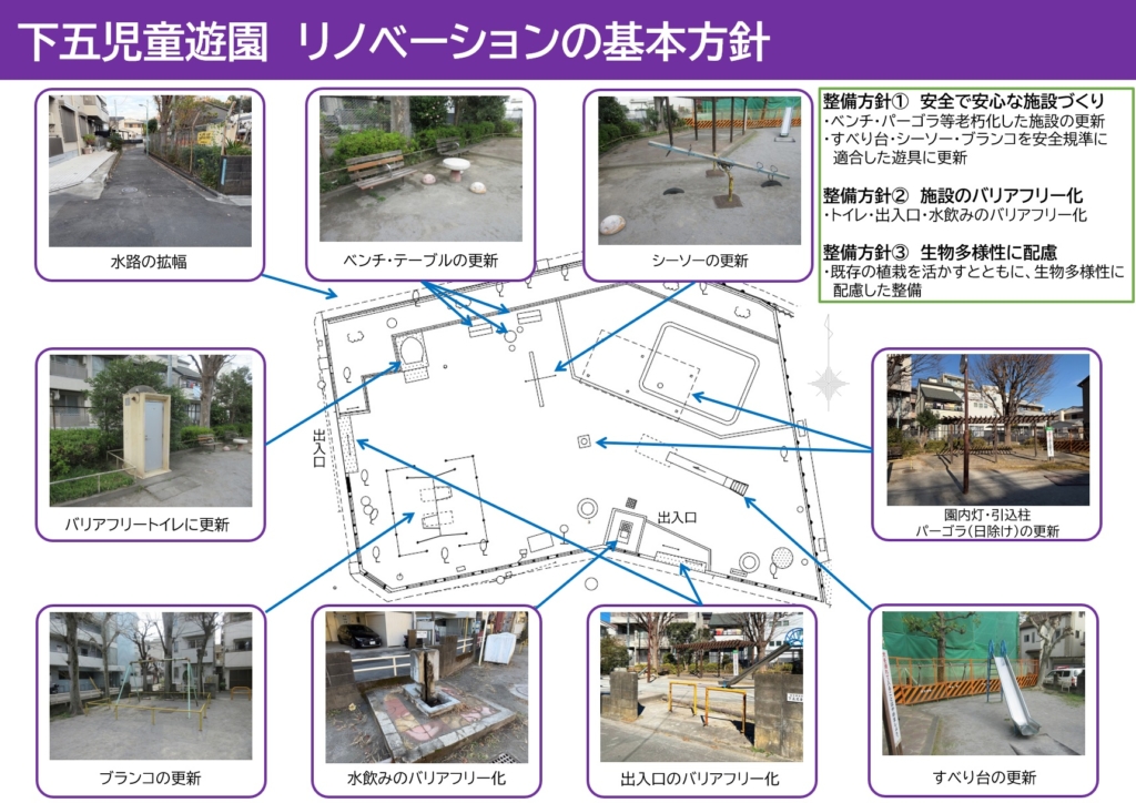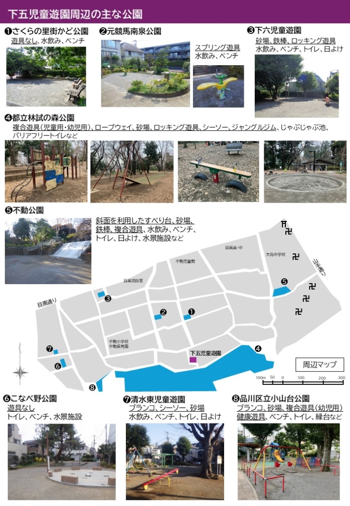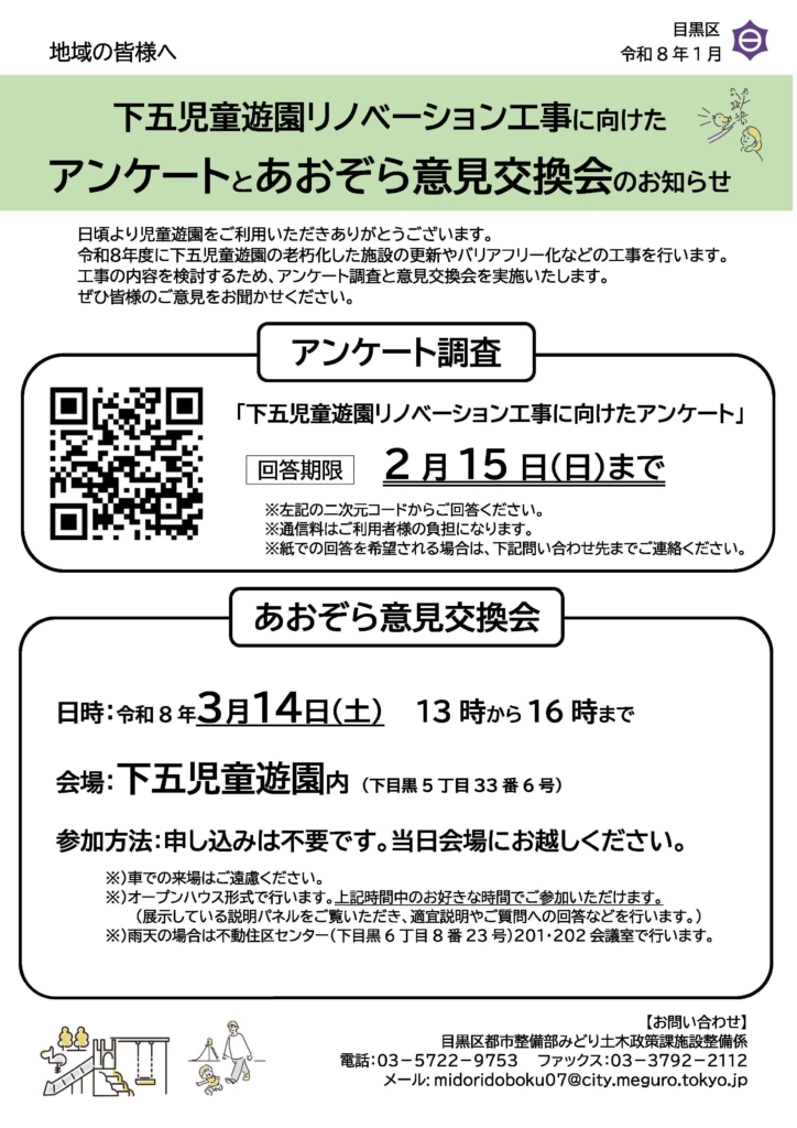来年度には下五児童遊園がリノベーションによりリニューアルされるのが楽しみです。ぜひ、皆さんの声をアンケートで目黒区に届けてください。よろしくお願いします。