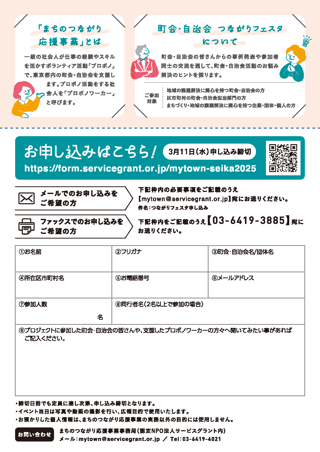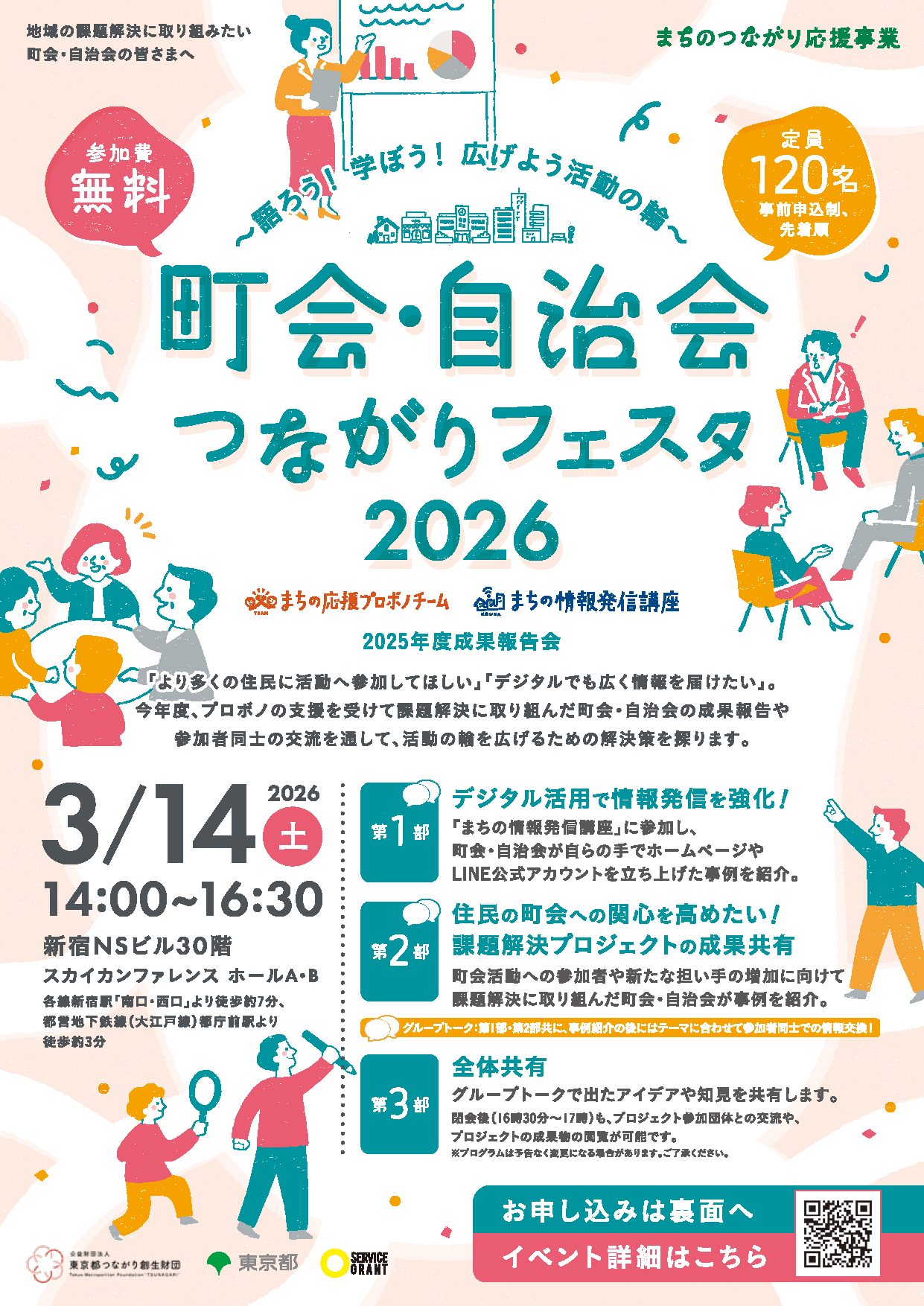 2026年3月14日(土)14時から16時半に新宿にて「町会・自治会つながりフェスタ2026」が開催されます。東京都つながり創生財団が行う「まちのつながり応援事業」に2025年度に参加した町会・自治会の成果報告と情報交換の場があります。ぜひご参加ください(お申し込みはこちら)。当日、会場でお会いできるのを楽しみにしています。