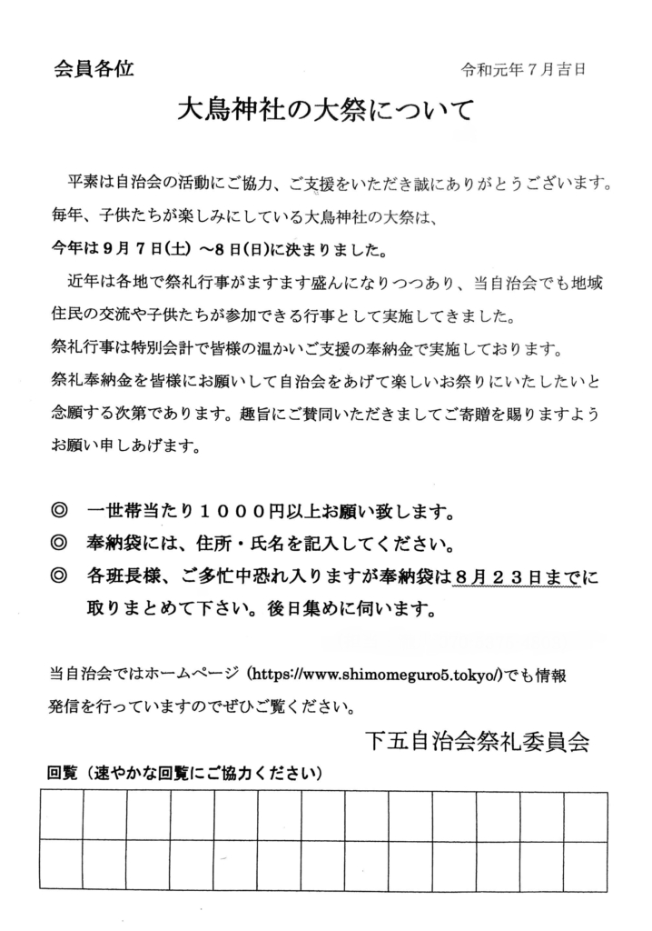 今年も大鳥神社の例大祭が「9月7日(土)と8日(日)」に行われます。下目黒五丁目自治会では、それに合わせて地域住民の交流や子供たちが参加できる行事としてお神輿や山車の町内巡行を行います。毎年たくさんの子供たちが参加しているため、大いに盛り上げていきたいと思います。