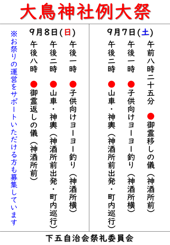 下五自治会お祭り(令和元年大鳥神社祭礼)のご案内
