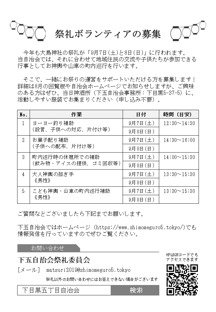 一緒にお祭りの運営をサポートいただける方も募集します! 当日、神酒所(下目黒5-37-5)に活動しやすい服装でお集まりください。